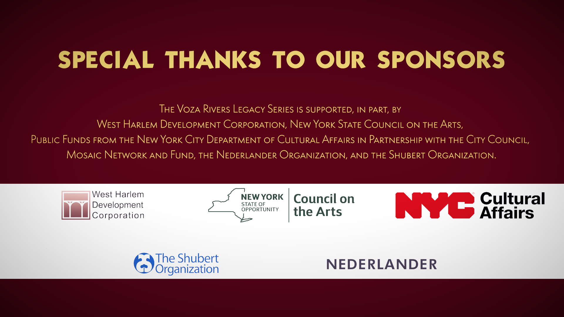 The Inaugural Voza Rivers Legacy Series honors a visionary whose six-decade career has transformed Harlem and the global arts landscape. Known for his humility, generosity, and tireless dedication to emerging new talent, Voza Rivers has made remarkable contributions to theater, film, music, dance, and social justice, creating vibrant, safe, and inclusive spaces for creativity, and empowering generations of artists to share their stories both locally and globally. This annual series will carry his legacy forward by nurturing new multidisciplinary voices from underserved communities, including BIPOC, LGBTQ+, and artists with disabilities with accessibility and inclusion at its core. Rivers has received numerous accolades including Tony Award® nominations, the Presidential Lifetime Achievement Award (Biden), the Gandhi-King Foundation Scholarship in his name, and numerous proclamations from NYC and NYS officials.